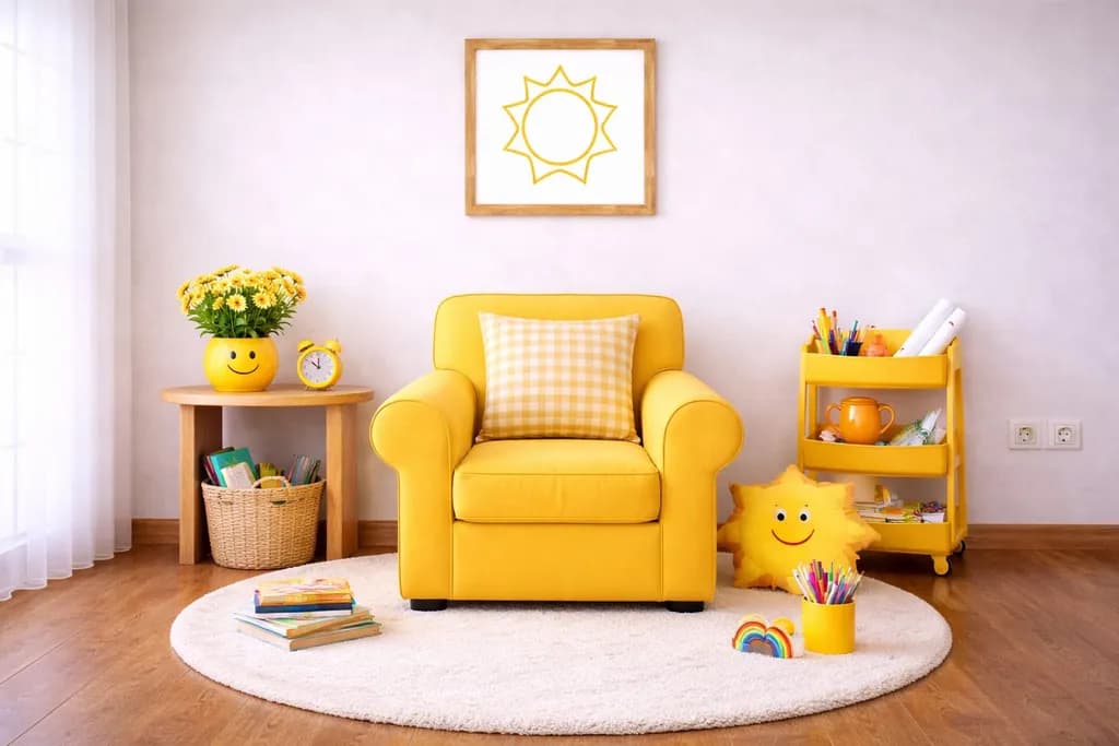 En ese sentido, desde la propuesta educativa de sensibilizar emocionalmente a los niños, y con el propósito educativo de promover la sensibilización emocional de los niños, diseñamos nuestro espacio sensorial para niños: el Optimismo en su modalidad individual a partir de un sofá infantil de color amarillo, unos cojines decorativos de colores amarillo y blanco, una alfombra circular blanca y un cuadro con la figura de un sol, que en conjunto invitan a cada niño a creer en sí mismo y a confiar en lo beneficioso y lo positivo de sus decisiones, sus acciones y sus logros cotidianos.